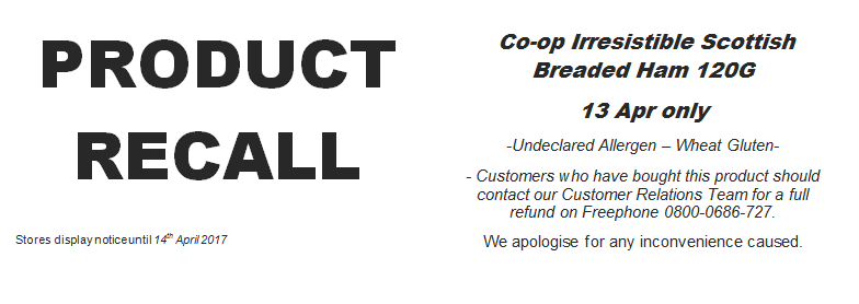 Co-op is recalling Co-op Irresistible Scottish Breaded Ham because it contains wheat (gluten) which is not mentioned on the label. This means the product is a possible health risk for anyone with an allergy or intolerance to wheat or gluten.