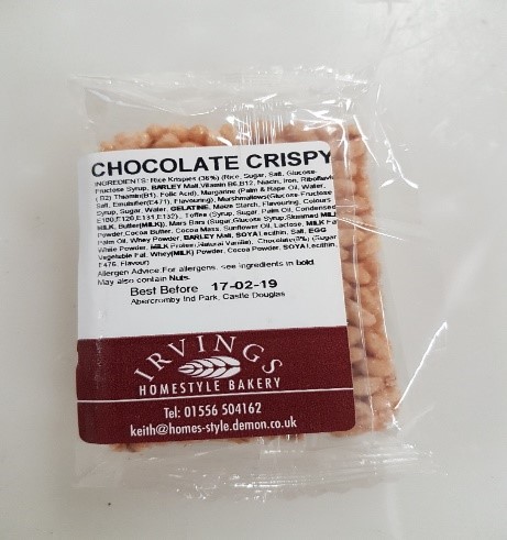 Irving’s Homestyle Bakery is recalling its individual and 5 finger packs of Chocolate Crispy because they contain wheat (gluten) which is not mentioned on the label. This means the products are a possible health risk for anyone with an allergy or intolerance to wheat or gluten.