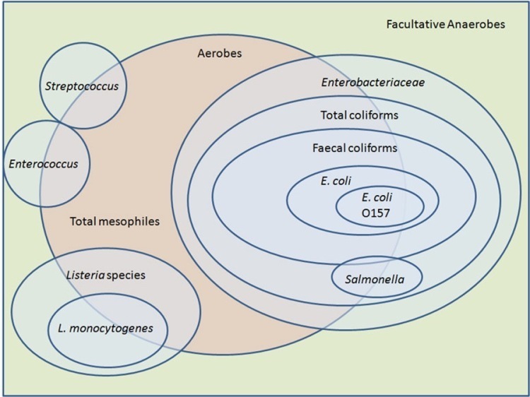 - Common indicators include: E. coli, Enterobacteriaceae, (faecal) coliforms, Streptococcus, Enterococcus, Listeria and total aerobic count. Suggested limit criteria from various issuing bodies are presented below.