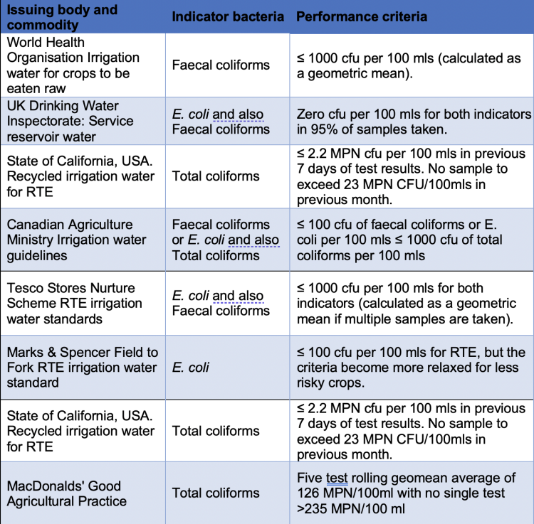 | Marks & Spencer Field to Fork RTE irrigation water standard | E. coli | ≤ 100 cfu per 100 mls for RTE, but the criteria become more relaxed for less risky crops. |