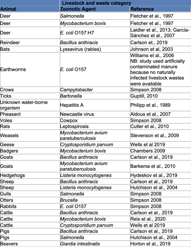In comparison to domestic livestock, comparatively little is known about the prevalence and numbers of zoonotic pathogens present in manure from wildlife. A comprehensive review has been published by Simpson (2008). A brief, and by no means complete, summary of what common indigenous British wildlife are known to harbour zoonotic pathogens is shown in Table 2 below. There are known examples of the same zoonotic pathogen being present on fresh produce, in irrigation water and in wildlife (but it is rarely clear if the water or crop infected the wildlife or vice versa). Table 2 attempts to include pathogens and wildlife that may not have been previously considered by growers as credible threats to the microbiological quality of their crops.