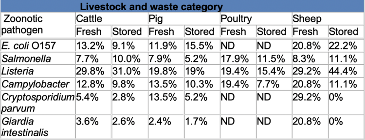 Table 1 The percentages of GB domestic livestock wastes that tested positive for each of the zoonotic agents listed. ND = not determined.